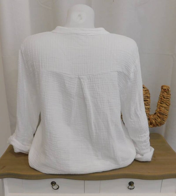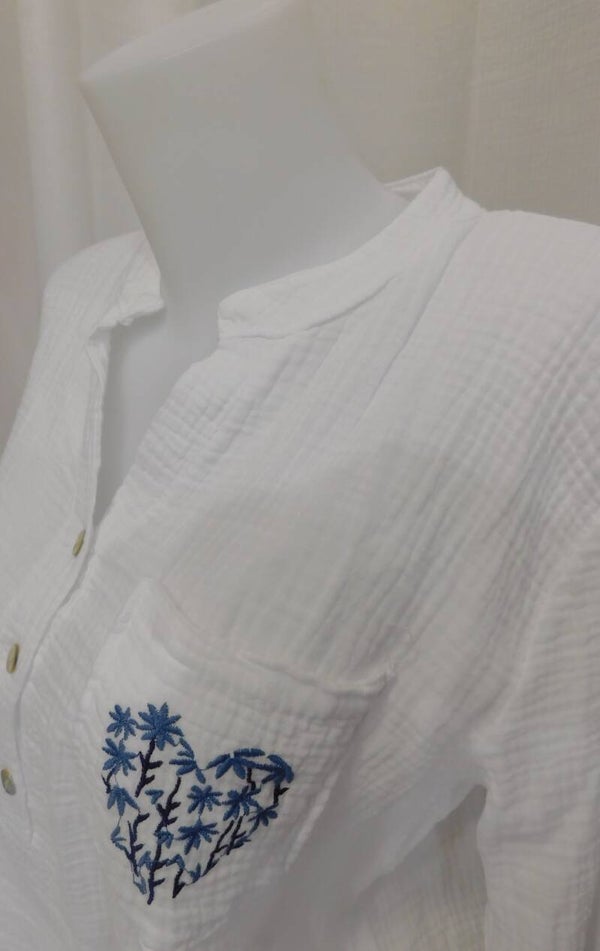 Tunique manches longues, boutons de nacre et poche côté gauche avec un coeur avec des fleurs brodées.