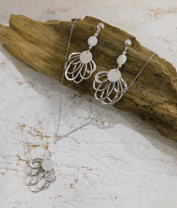 Bijoux réalisés avec des pendentifs en métal argenté et en nacre.