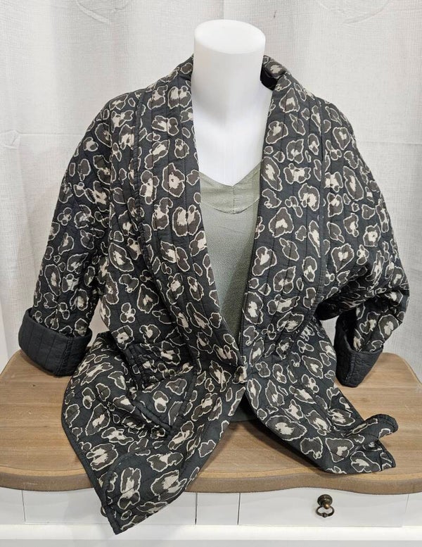 Veste matelassée, imprimé léopard, couleur gris anthracite. Deux poches à l'avant.