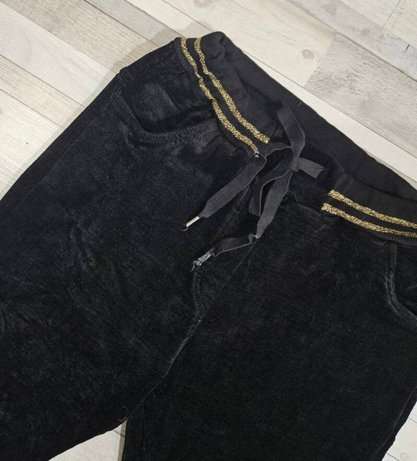 Pantalon velours avec une ceinture dorée, deux poches avant et deux poches arrière.