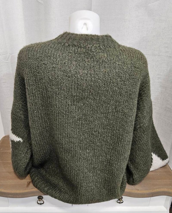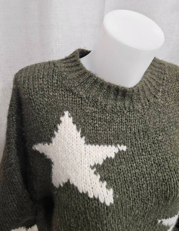 Pull épais, col rond, étoiles - kaki