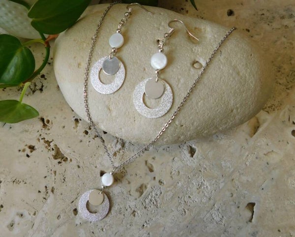 Les boucles d'oreilles sont réalisées avec différents élentments en métal argenté et une perle de nacre.