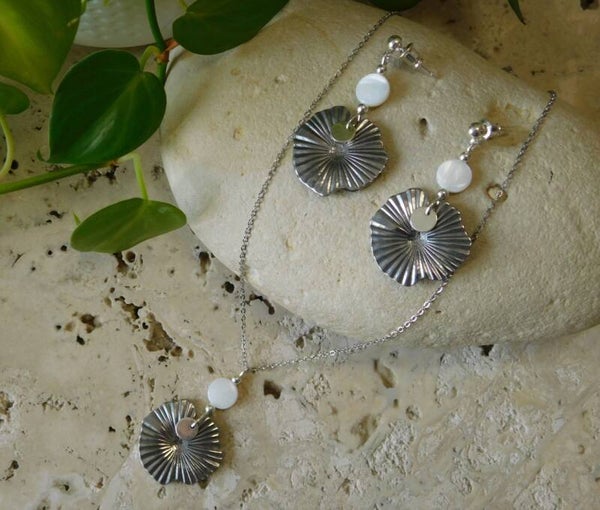 Bijoux réalisés en métal argenté, avec une pièce en nacre.