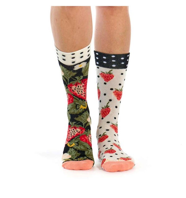 Les mi-chaussettes fantaisie femme, dépareillées, Fragaria séduisent par leurs motifs asymétriques : une chaussette noire ornée de fraises rouges et de leurs feuilles kakies et une blanche cassée à pois noirs avec des fraises rouges.